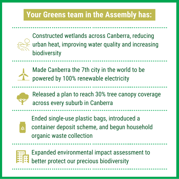 Much of the ACT’s unique national park ecosystems were devastated by the bushfires over the summer, and are further threatened by our sprawling city, expanding ecological footprint, and mismanagement of the land and water. Meanwhile, our unique urban ecosystems are threatened by overdevelopment, habitat and biodiversity loss, and inadequate resourcing of conservation.